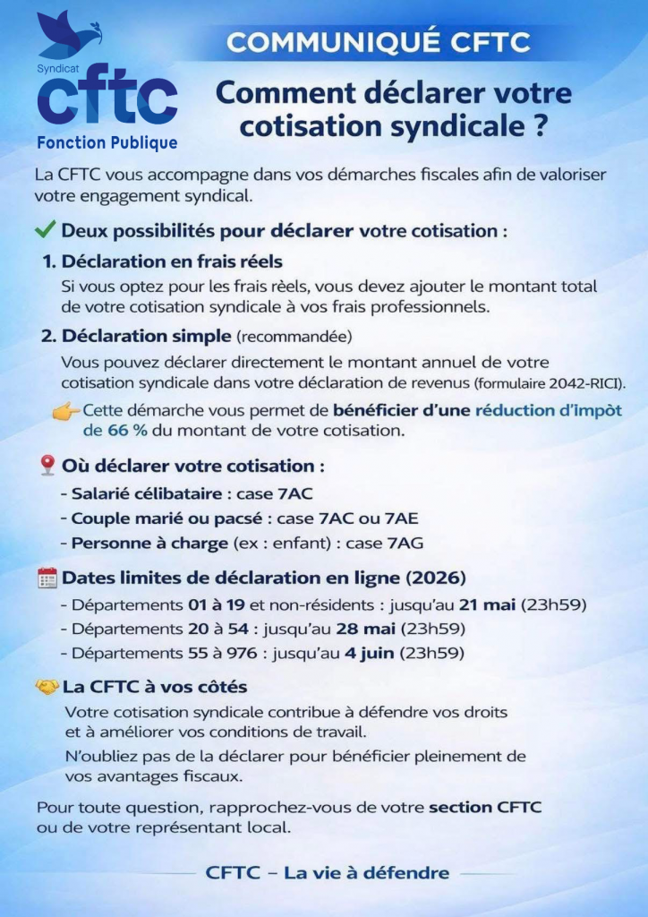 Chers adhérents, la période fiscale approche et la CFTC Fonction Publique reste à vos côtés pour valoriser votre engagement. Saviez-vous que votre cotisation syndicale vous donne droit à des avantages fiscaux concrets ?
